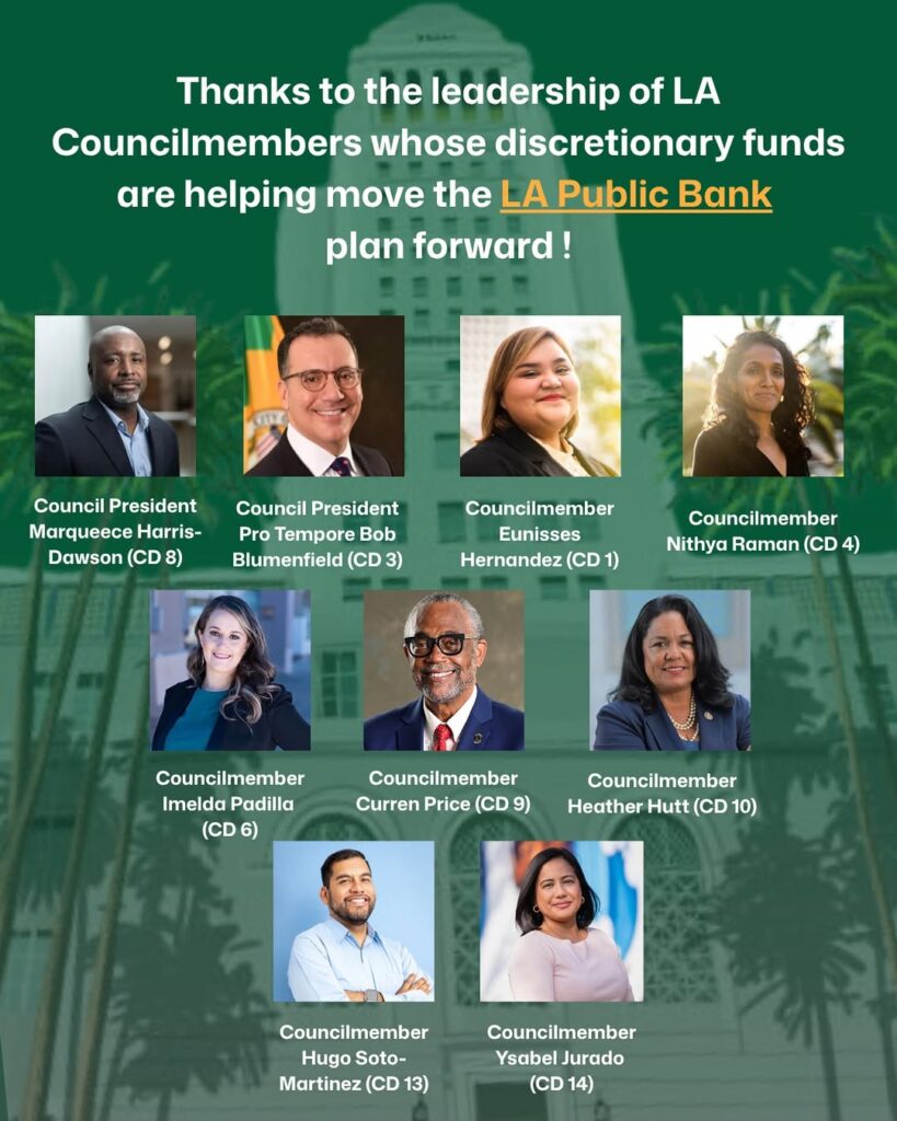 Big news! Councilmembers Imelda Padilla and Heather Hutt just stepped up with discretionary funds to support the LA public bank plan. With 9 Councilmembers on board, a majority now supports the public bank plan.