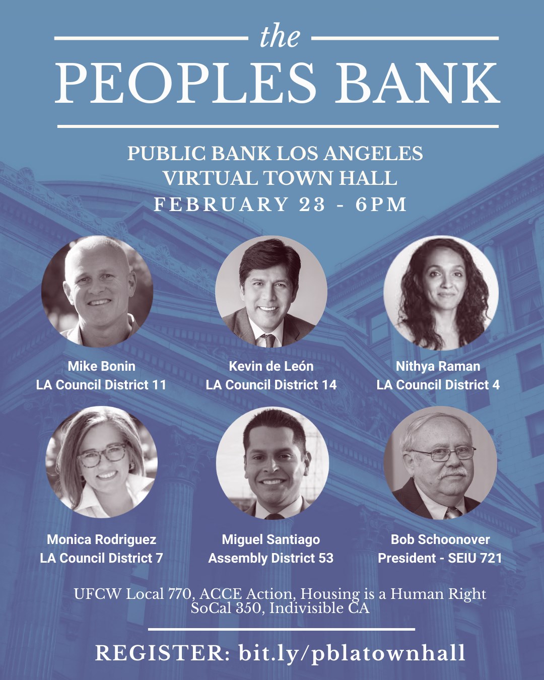 Public Bank LA Virtual Town Hall with LA City Councilmembers Mike Bonin, Nithya Raman, Monica Rodriguez, Assemblymember Miguel Santiago, Bob Schoonover, President of SEIU 721, Rachel Torres, Deputy Political and Civil Rights Director UFCW Local 770, and representatives from ACCE Action, Housing is a Human Right, and Indivisible California StateStrong.